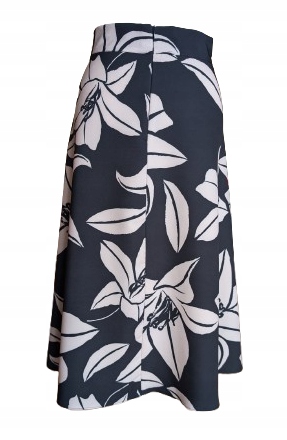 Ta spódnica to kwintesencja klasy i subtelnej kobiecości. Uszyta z wysokiej jakości materiału, który delikatnie układa się na sylwetce, podkreślając jej atuty. Czarna baza nadaje spódnicy ponadczasowego charakteru, a beżowe kwiatowe wzory dodają jej lekkości i romantyzmu. Długość midi sprawia, że jest idealna zarówno na formalne spotkania, jak i eleganckie wyjścia. Spódnica posiada delikatny fason lekko rozszerzający się ku dołowi, co zapewnia swobodę ruchów i komfort noszenia. Doskonale komponuje się z klasycznymi szpilkami i prostą bluzką lub eleganckim żakietem. Spódnica posiada kryty zamek, który jest dyskretnie wszyty z tyłu, dzięki czemu nie zaburza eleganckiego wyglądu i zapewnia wygodne zapinanie.