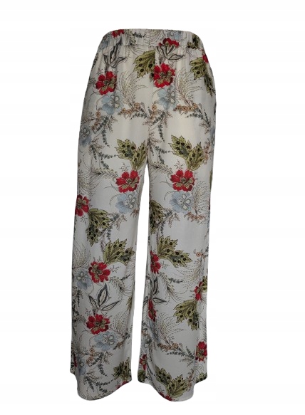 Spodnie palazzo z wiskozy na gumie z kieszeniami w kwiaty to stylowy i wygodny element garderoby, który łączy w sobie kobiecość, lekkość i funkcjonalność. Oto ich opis: